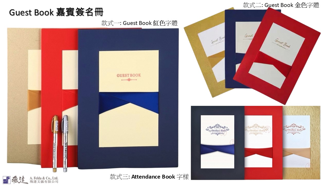 尺寸: 35 x 24cm 空白內頁 顏色: 金色 (現貨) / 紅色 (現貨) / 藍色 (現貨) 附送簽名筆 (隨機) 訂購嘉賓簽名冊, 消費金..